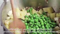 Esta apetitosa crema, se prepara con guisantes, cebolla, puerro y patata. Se sirve con salmón, huevos de codorniz hervidos, albahaca y nata.