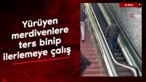 İlginç görüntü: Yürüyen merdivenlere ters binip ilerlemeye çalıştı!