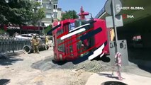 İstanbul Beylikdüzü’nde İSKİ’nin alt yapı çalışmaları sırasında yolun çökmesi nedeniyle hafriyat kamyonu devrildi.