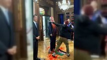 Netanyahu'nun heykelini parçaladı! Kırmızı boya döktü, çekiçle vurdu…