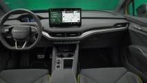 Die Design Selection Lodge bestimmt das Interieur des Škoda Elroq First Edition. Die orangenfarbenen Akzente von Kontrastnähten, Sicherheitsgurten und dem Streifen auf den Leichtmetallfelgen gehen auf das Design des Vision 7S zurück. Die grauen Sitzbezüge mit anthrazitfarbener Sitzfläche bestehen aus dem nachhaltigen Material TechnoFil und grauem Kunstleder. Das Dreispeichen-Sportlenkrad trägt ein First Edition-Emblem, Edelstahloptik ziert die Pedalerie. Die umfangreiche Serienausstattung umfasst einen 13 Zoll großen Infotainmentbildschirm, ein Head-up-Display mit Augmented Reality, KESSY inklusive Walkaway-Funktion sowie hintere Seitenairbags. Auch eine Rückfahrkamera, Area View (360 Grad Umgebungskamera), die elektrische Komfortöffnung für den Gepäckraum sowie ein elektrisch verstellbarer Fahrersitz inklusive Memory- und Massagefunktion sind bei der First Edition immer an Bord.