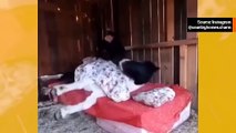 Videolla kolme nälkäistä koiraa nuolevat innokkaasti televisioruutua, jossa näkyy mehukkaita pekonisiivuja paistumassa – kuin olisivat keskellä kuvitteellista juhla-ateriaa.