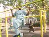 But just as she grabbed the pull-up bar, it gave up on life, and so did her balance.