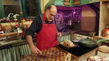 Il pollo e' aperto, steso su un letto di timo e d'aglio e rosolato nello Sherry. Si profuma mantenendo la sua tenerezza.