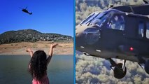 Hatay'ın Yayladağı ilçesinde orman yangınına müdahale ederken baraj gölünden su alan Sikorsky tipi askeri helikopterin pilotu, Hifa Sakarya'ya (5) el salladı.