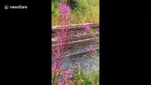 Footage shows fast-flowing floodwater submerging a train track, causing some ScotRail services to be suspended.