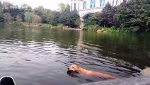 Golden retriever attacked by black swan when swimming in lake in China