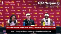 USC Trojans Coach Lincoln Riley, Wide Receiver Makai Lemon, and Cornerback DeCarlos Nicholson discusses players who impacted the game