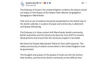 Israeli embassy in London condemns synagogue attack in Manchester