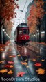 A Red Tram’s Journey Through a Rainy Autumn Wonderland