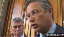 Nicolas Dupont-Aignan, tête de liste "Debout la République" est venu soutenir Jean-Pierre Enjalbert, le maire de Saint-Prix. Le sujet du jour : les transports en Ile de France. (DROITS RESERVES . Pour toute exploitation sur TV, web, mobile, aller sur http://wizdeo.com/s/banqueimages )