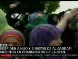 La televisión pública de Libia difundió imágenes de los familiares de Muammar Al Gaddafi que murieron durante un bombardeo el sábado, mientras manifetantes se concentraron en la morgue para despedir los cuerpos del hijo y tres nietos del líder. teleSUR
