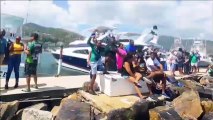 Pre-fishing preparations take a comical turn when woman slips into lake