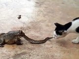 Un serpent pris au piège par une grenouille se bat contre un chat