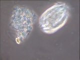 Faunes vivantes observées : rotifères (Lecane et autre). Détail lobes rotatoires cillés en mouvement et aspiration de bactéries libres. Nage et prédation bactérienne par rotifère.