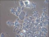 Examen de boues de papeteries (alimentant le pilote Christopher) ayant subi la coloration Neisser en microscopie à lumière transmise : certains flocs et filaments sont colorés en vert (Neisser positif) ; le reste ne prend pas (couleur beige gris, Neisser négatif).