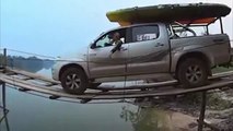 Truck attempting to go across a very thin wooden bridge