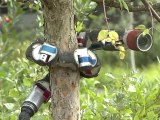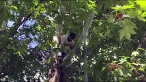 A pet fox is climbing into a tree in a garden. Un renard apprivoisé grimpe dans un arbre dans un jardin.