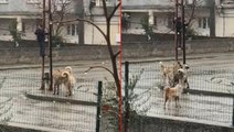 Sokak köpeklerinden korkup elektrik direğine tırmandı! Küçük çocuğun korku dolu anları kamerada