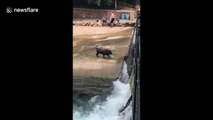 Dog plays fetch with himself in the pool