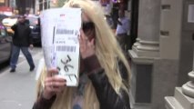 Amanda Bynes cache son visage derrière une enveloppe Fed Ex pendant qu'elle est questionnée sur sa famille, la gloire et son comportement récent à New York.