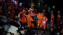 Emergency responders rescue a Chinese man caught in a blast that ripped through a Shandong province factory on Monday.