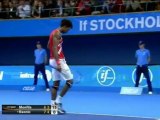 Gael Monfils upset Milos Raonic in straight sets in the opening round of the Gerry Webber Open in Halle.