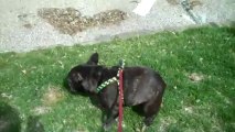 Un petit bouledogue français effrayé par ses flatulences. A chaque fois qu'il pète, il se retourne pour voir d'où vient le bruit.