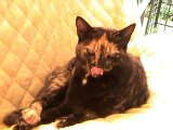 fripouille fait sa toilette sur le lit