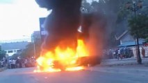 Protesters burn police car after voting ends in Cambodia