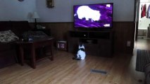 Paws tries to play with his toys he sees on Daily Motion TV