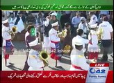 Army unit with drums and trumpets marching with the tunes at Tattoo festival.