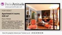 Cet appartement de 220 m² , 4 pièces, est situé avenue Victor Hugo dans le 16ème arrondissement , au 4ème étage d'un immeuble du 19ème siècle et il peut accueillir 9 personnes (7 adultes et 2 enfants). Cet appartement est équipé avec : un lave linge, un sèche linge, un lave-vaisselle, les chaines cablées, la télévision, un accès internet haut débit illimité avec le wifi, un téléphone, une chaine hifi, une cheminée décorative.