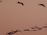 grues dans le soleil couchant