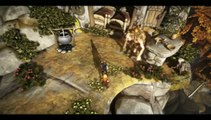 To lower the bridge get the smaller brother into the wheel and let continously walk in one direction. Walk the big brother across the now lowered bridge and pick up a sheep. Carry the sheep across and drop it into the wheel.