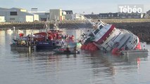 Les opérations de renflouement de l'Estran, ce chalutier immatriculé au Guilvinec et basé à Saint-Guénolé-Penmarc'h (29) qui s'était échoué le 20 janvier, à l'entrée du port de Saint-Guénolé, sont actuellement en cours. Les images de Claude Prigent.