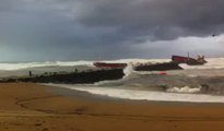 Un cargo espagnol avec onze ou douze membres d'équipage, dont un blessé, s'est brisé mercredi sur une digue d'Anglet, au Pays basque, et l'équipage a pu être évacué à la faveur d'une fenêtre météo favorable. Durée: 00:38