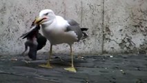 Önüne atılan sosisi bütün olarak yutmaya çalışan martı başta başaracak gibi görünse de sonunda kustu.