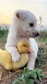 small dog play with chickens so cute