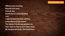 In her eyes on her frail frame four monsters feast Of shame she dies vanishes her name devoured by the beasts!Pradip Chattopadhyayhttp://www.poemhunter.com/poem/of-shame-she-dies/