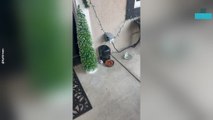 While being filmed playing outside in the backyard, these cats sat back and watched as a sneaky raccoon suddenly walked up on the porch and proceeded to eat a meal left out for them. Annoyed, the raccoon kept moving the food bowl away because one of the cats was a bit too curious and wouldn't leave her alone. Finally the poor raccoon tried to run away with the food bowl, but ended up spilling it all over the porch instead.