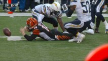 San Diego Chargers running back Ryan Mathews leaps over the line in an attempt to score, but Dallas Cowboys safety Jeff Heath forces the fumble allowing safety Terrance Mitchell to recover.