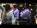 Supporters of the BJP party campaigning with a drum and distributing pamphlets to the people.