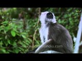 A mother Langur caresses its baby and cleans it. The restless baby Langur does not stay still and is constantly moving around in awe of its surroundings.