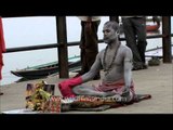 This sadhu lives on the banks of the Ganga or Ganges river. He smears ash over his body each day. he does a reverse strip tease with his loin cloth - first draping his body with the cotton cloth and then tying it around his loins, and smearing more ash over himself.