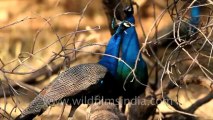 The Indian Peafowl or Blue Peafowl (Pavo cristatus) is a large and brightly coloured bird of the pheasant family native to South Asia, but introduced and semi-feral in many other parts of the world. The male, peacock, is predominantly blue with a fan-like crest of spatula-tipped wire-like feathers and is best known for the long train made up of elongated upper-tail covert feathers which bear colourful eyespots. These stiff and elongated feathers are raised into a fan and quivered in a display during courtship. The female lacks the train, has a greenish lower neck and has a duller brown plumage. They are found mainly on the ground in open forest or cultivation where they forage for berries, grains but will also prey on snakes, lizards, and small rodents. Their loud calls make them easy to detect, and in forest areas, often indicate the presence of a predator such as a tiger. They forage on the ground, moving in small groups and will usually try to escape on foot through undergrowth and avoid flying. They will fly up into tall trees to roost, however. It is the national bird of India.