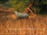 A Blue Jay or Indian Roller (Coracious bengalensis) flies up to a Kikar tree, while a herb of nilgai (Boselaphus tragocamelus), often mistaken to be a cow due to is Hindi name nilgai, or actually an antelope! Meanwhile, a Hoopoe (Upupa epops) flies through the frame as well.