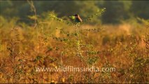 Indian Roller (Coracious bengalensis) is also called Blue Jay and in Hindi, it is the Nilkanth. It is 13 inch long and is striking blue in colour. Indian Roller weighs around 80 -100 g. It's eyes and bill are black. It has a large head and short neck. Its crown, lower wings and tail are blue green in colour. The throat and upper breast are purple in colour. The back and abdomen are gray in colour. Males and females are similar in appearance. Indian Roller prefers open ground, cultivated fields, local parks and cities at lower elevation. Indian Roller is omnivorous. It mainly feeds on frogs. It also favours lizards, acorns, grasshoppers, crickets, Butterflies and moths. Incubation takes 18 -- 20 days. It lays 4- 5 eggs in the month of March or April. The longevity of Indian Roller exceeds up to 17 years of age.