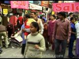 The bustling middle class market of Sarojini Nagar, a very busy place in Delhi. Here, we see traffic, parked two wheelers, playing children, shops, salesmen, vendors, shoppers, a busy park, a Samsonite showroom and the chaos and bustle of this busy market place.