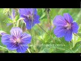 Snowy landscape of Valley of flowers. Geranium wallichianumand Senecio flowers with Rataban peak in the Bhyundar valley, wafting in the wind!